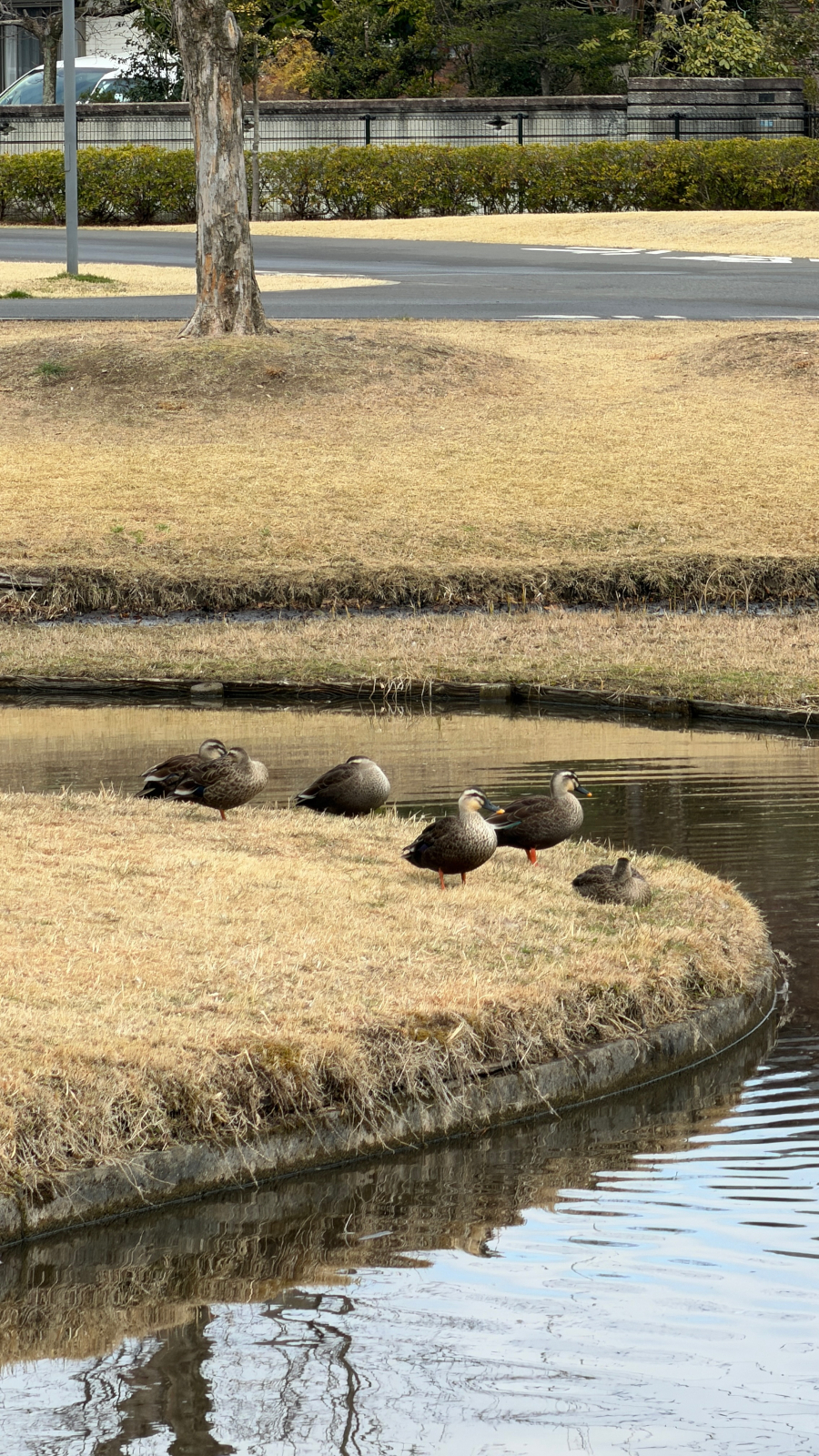 公園に、ツバキの赤やピンクが春らしく彩りはじめました