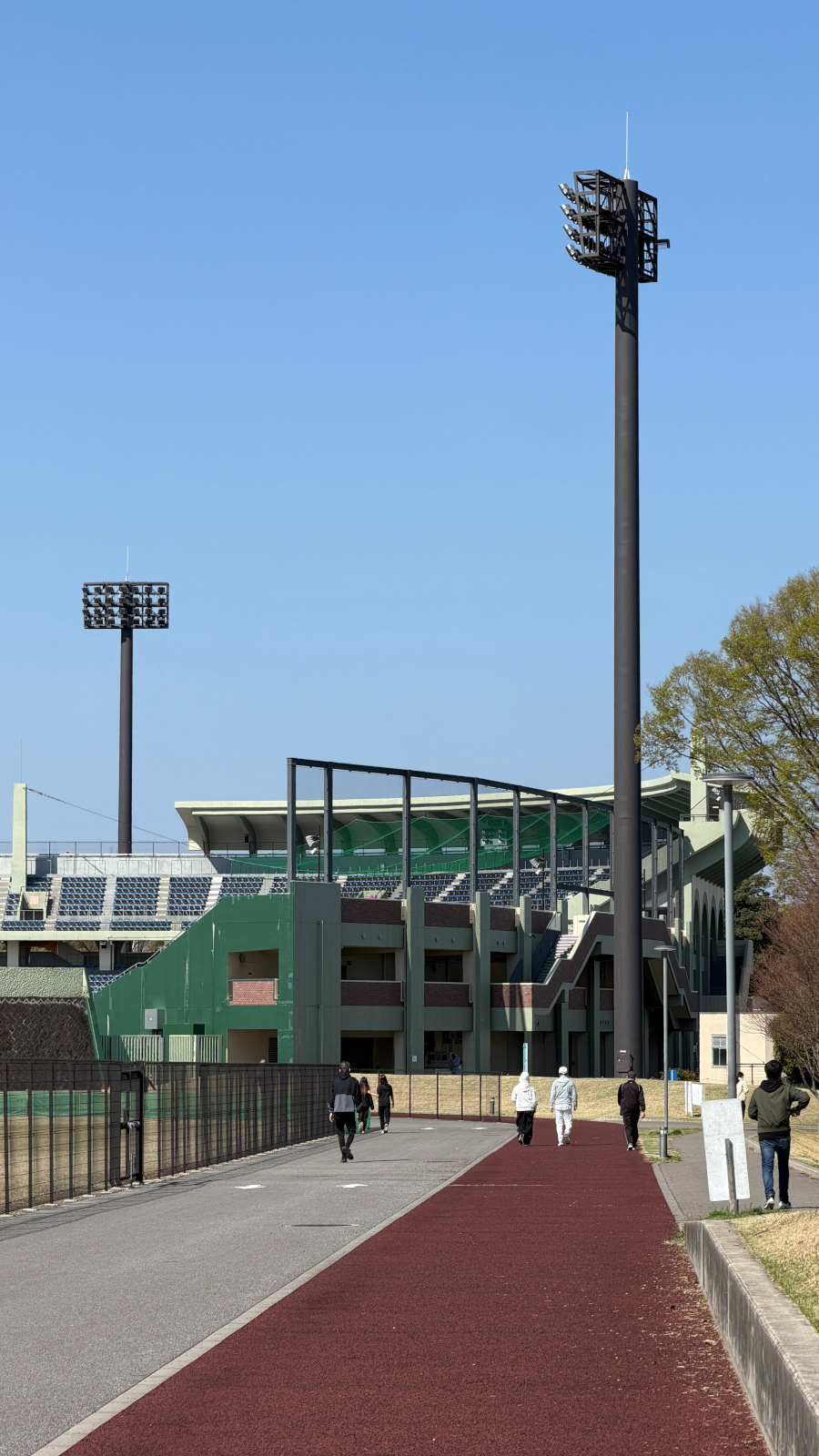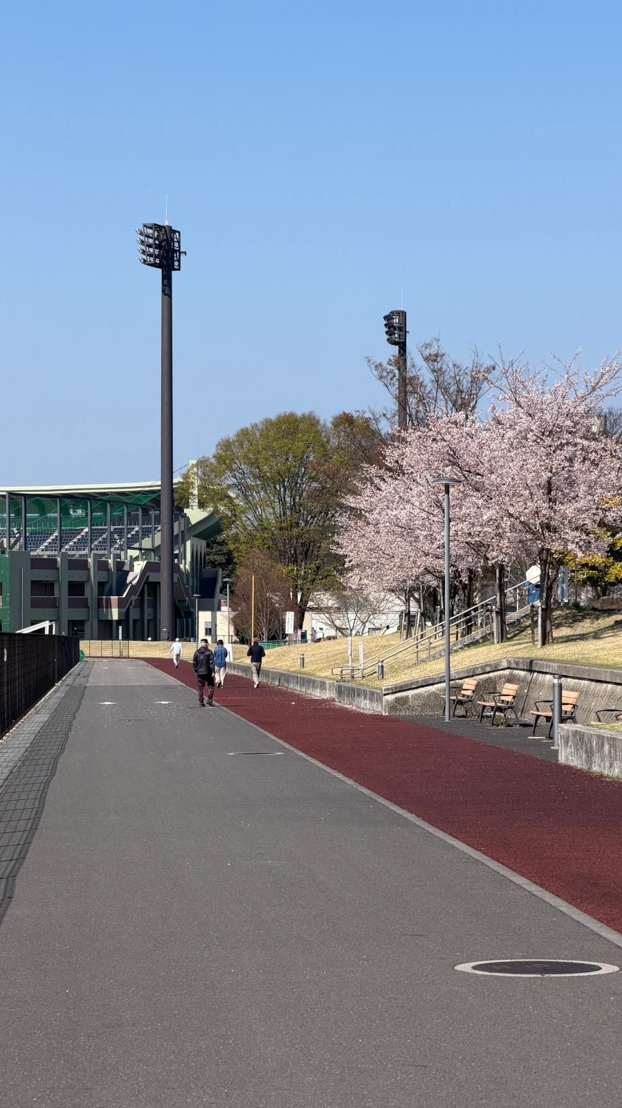 サッカー・ラグビー場の外周コースは、一周906メートルの弾性舗装が施された歩き心地の良いジョギング・ウォーキング専用コースで、反時計回りで進行することがルールとなっています.東第1駐車場に隣接していることから、多くの方に利用されています.運動公園内でも特に人気が高く、春には見事な桜のトンネルを楽しむことができるのも魅力のひとつです.また、長年ウォーキングを続けていらっしゃるだろうとお見受けする方も多く、人生の大先輩に軽やかに追い越されることも珍しくありません.(運動公園の全体マップはこちら)