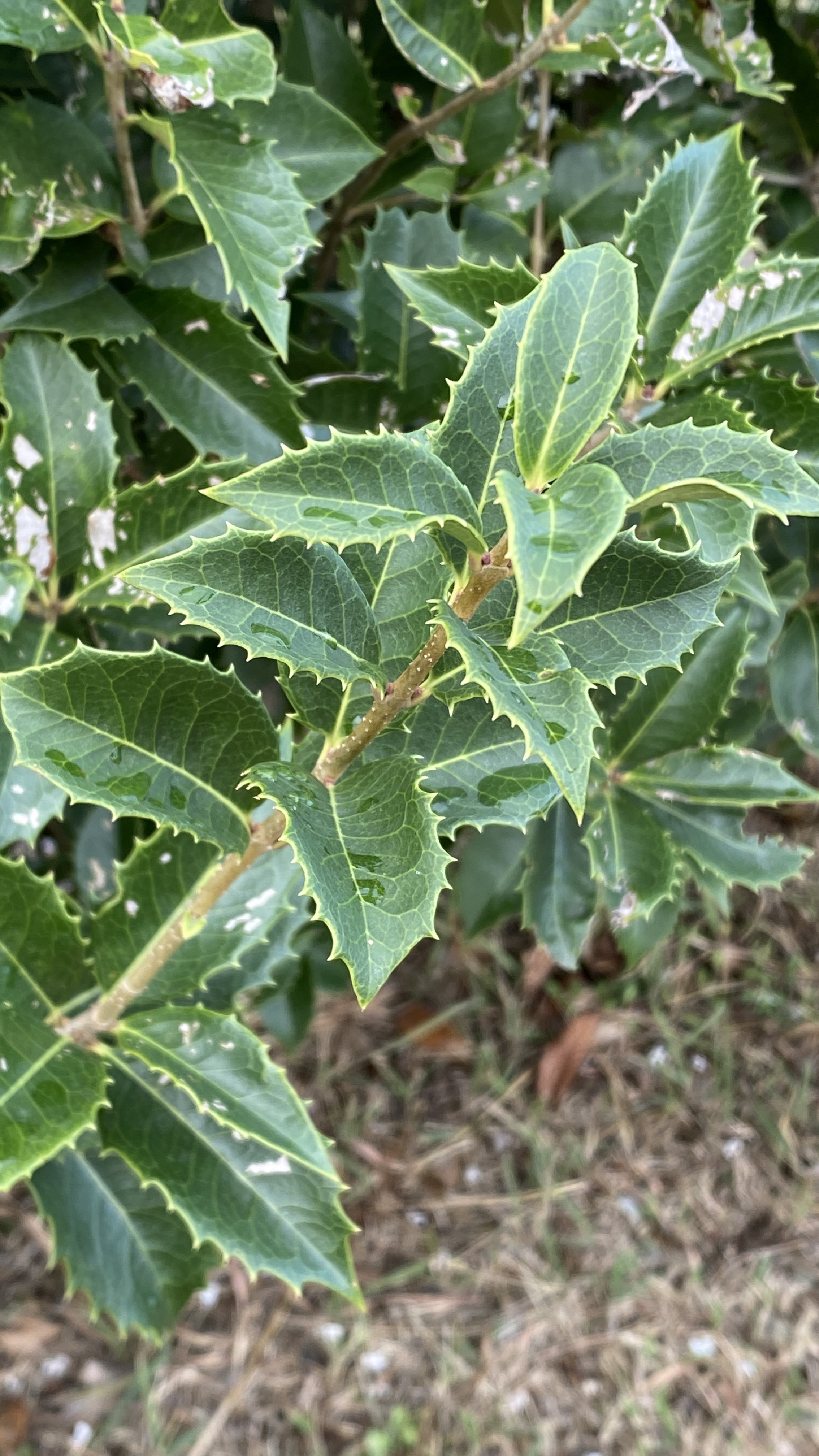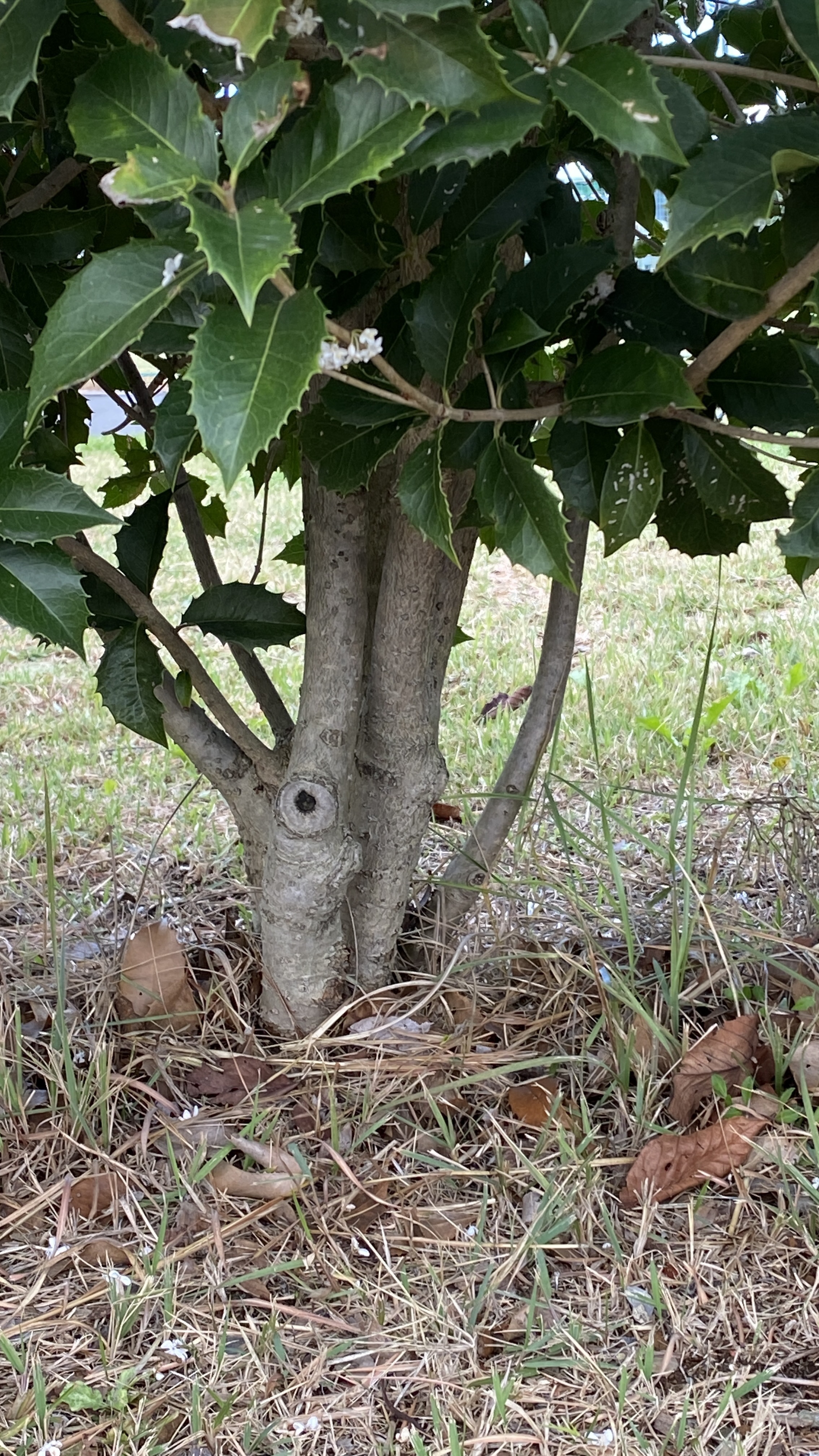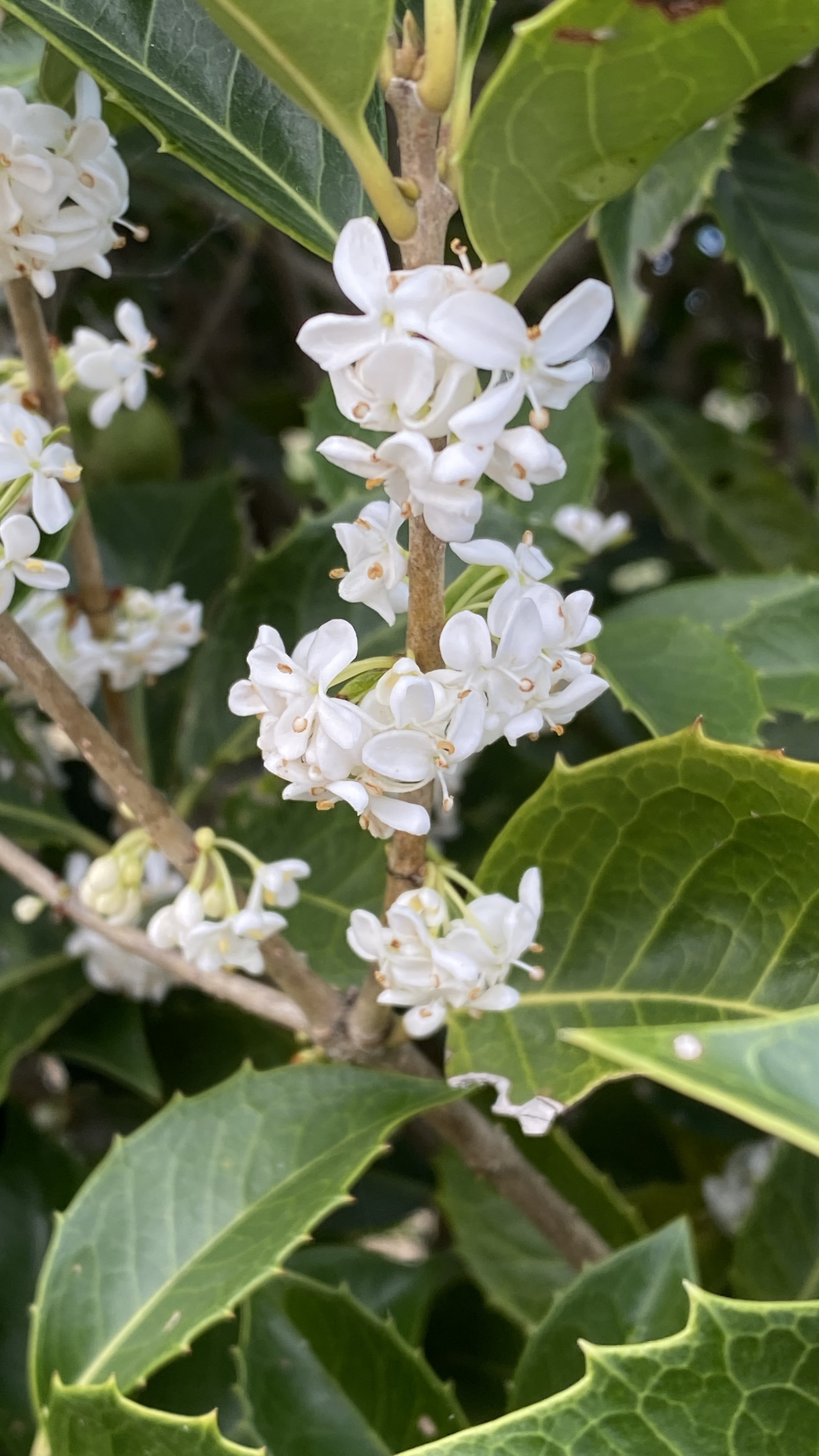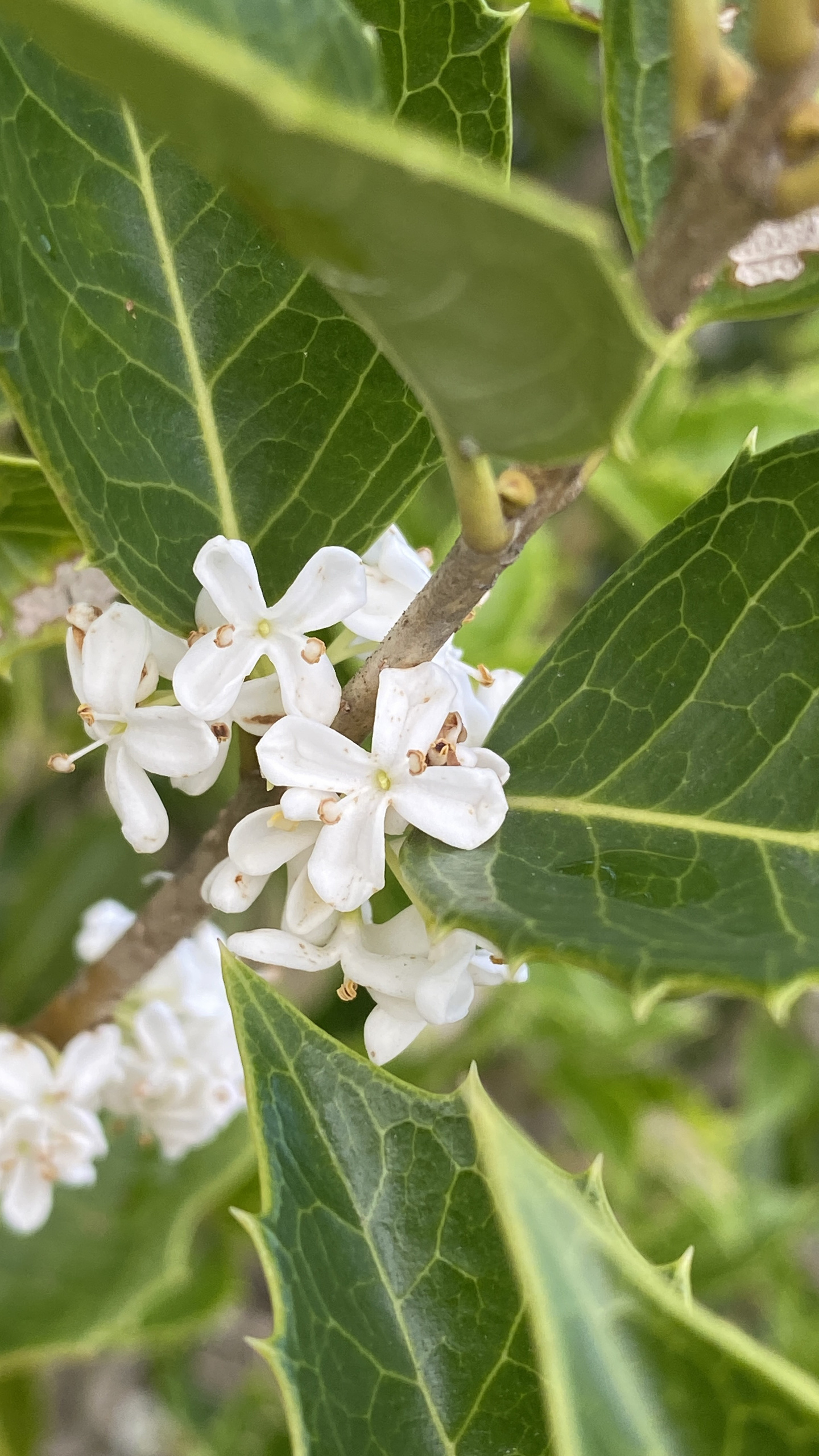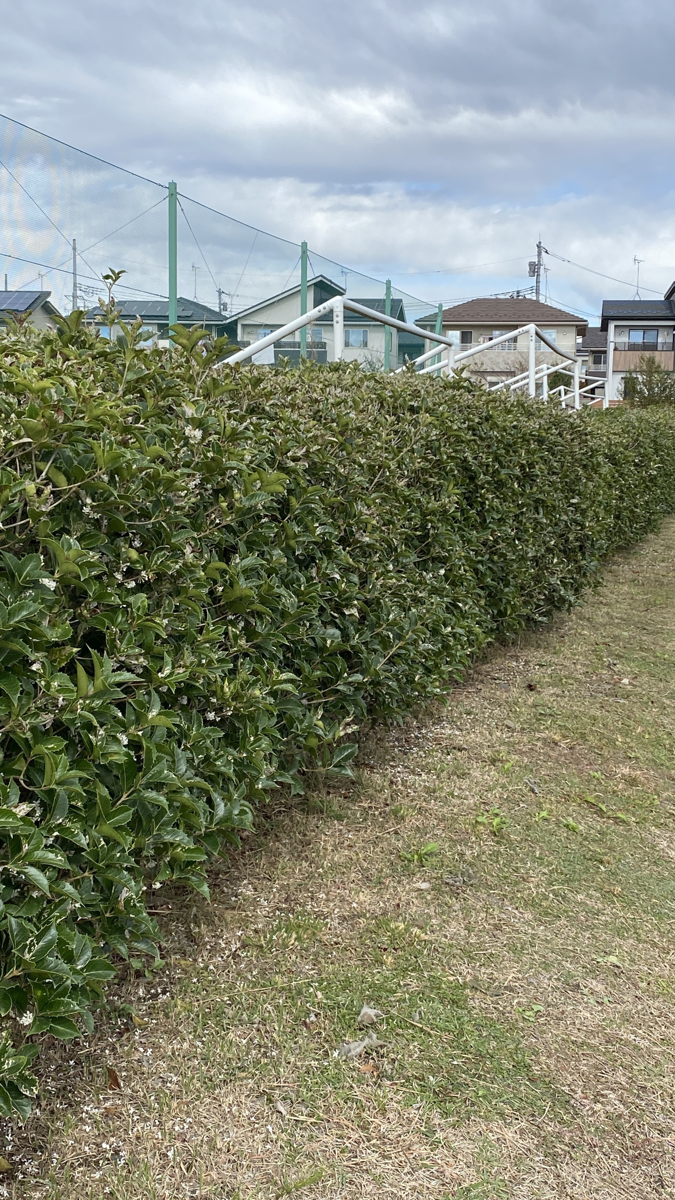 ヒイラギモクセイは,ギンモクセイとヒイラギの交雑種といわれています.葉の先端は少し尖り,縁にはヒイラギのようなトゲが8〜10対ほどあります.秋になると,ギンモクセイに似た白い花を咲かせます.花の香りはキンモクセイのように甘くやさしく,ふんわりと広がる控えめな香りが心を落ち着かせてくれます.なお,日本では雄株が中心であるため,種子はできません.運動公園では,サッカー・ラグビー場の東第一駐車場側にある生垣として植えられており,秋の訪れを静かに告げるように可憐な花を咲かせています.