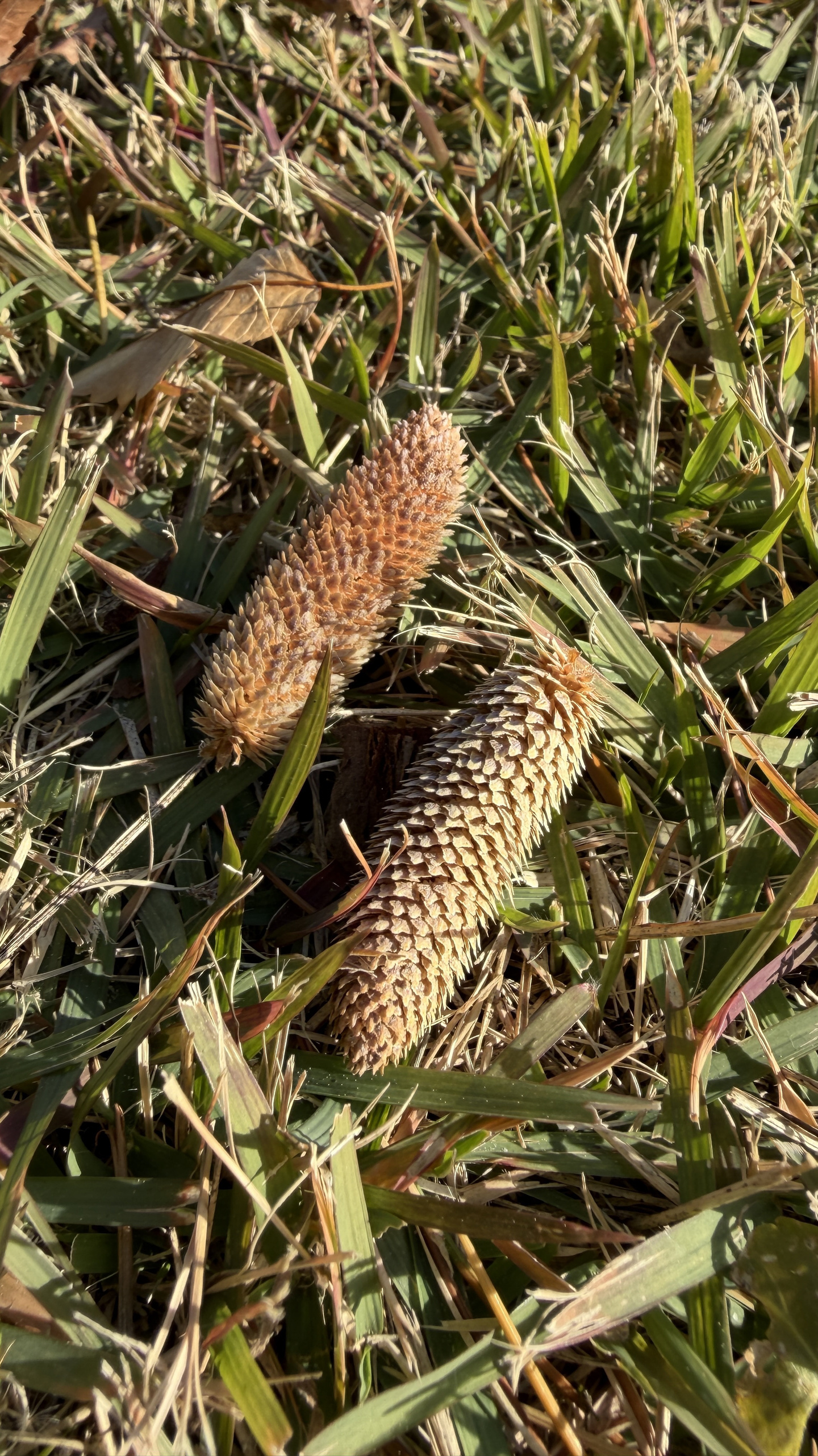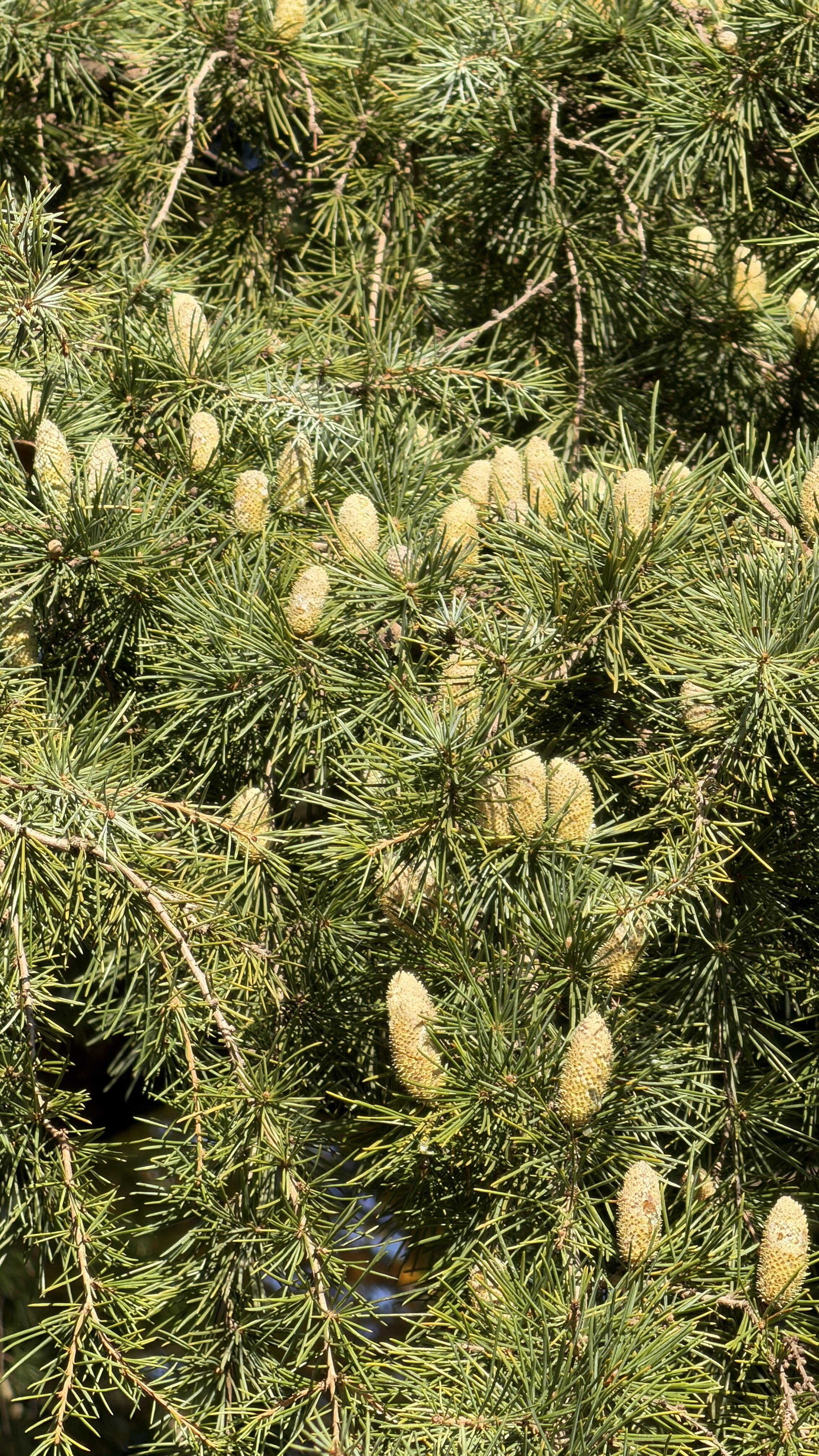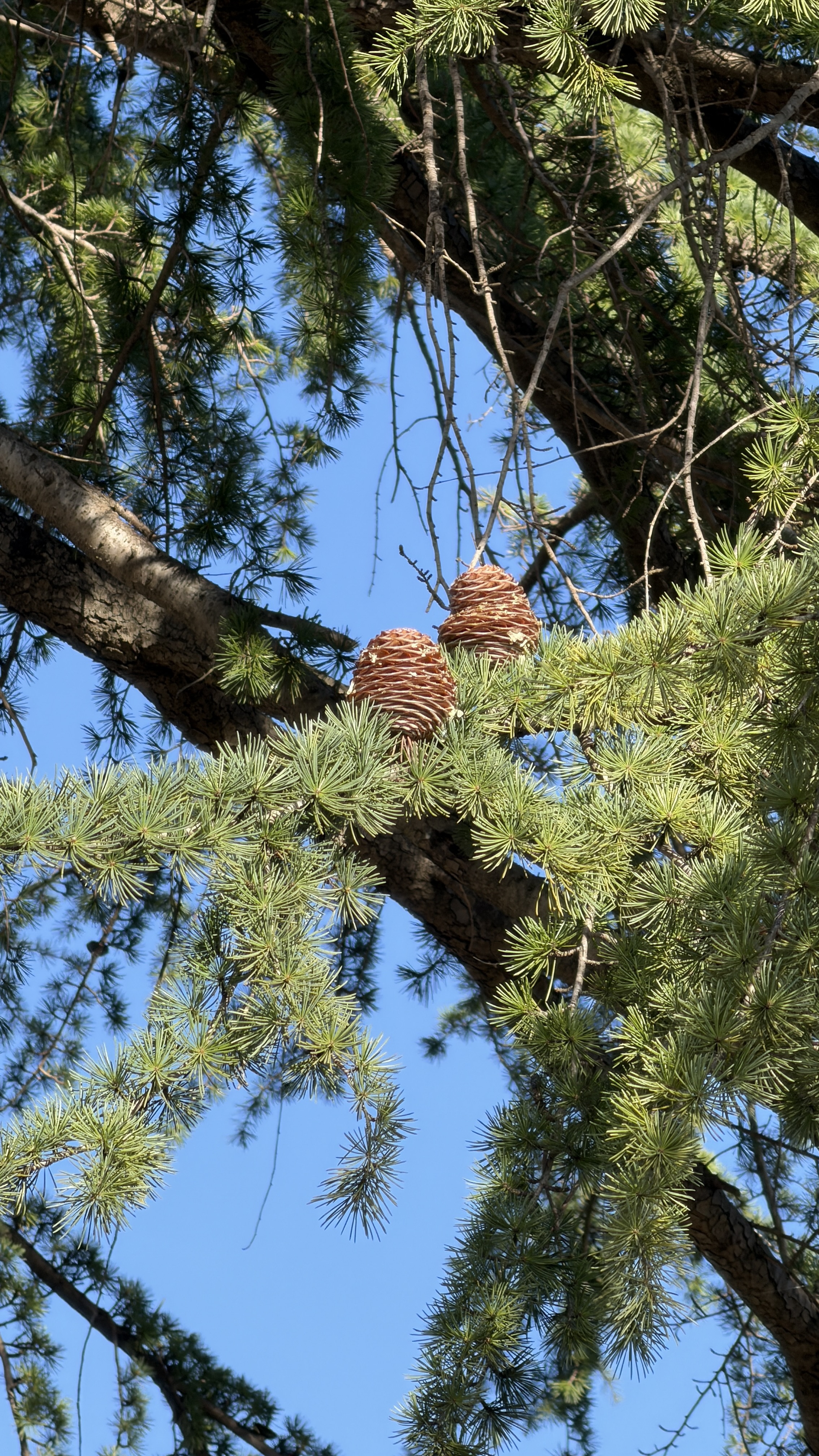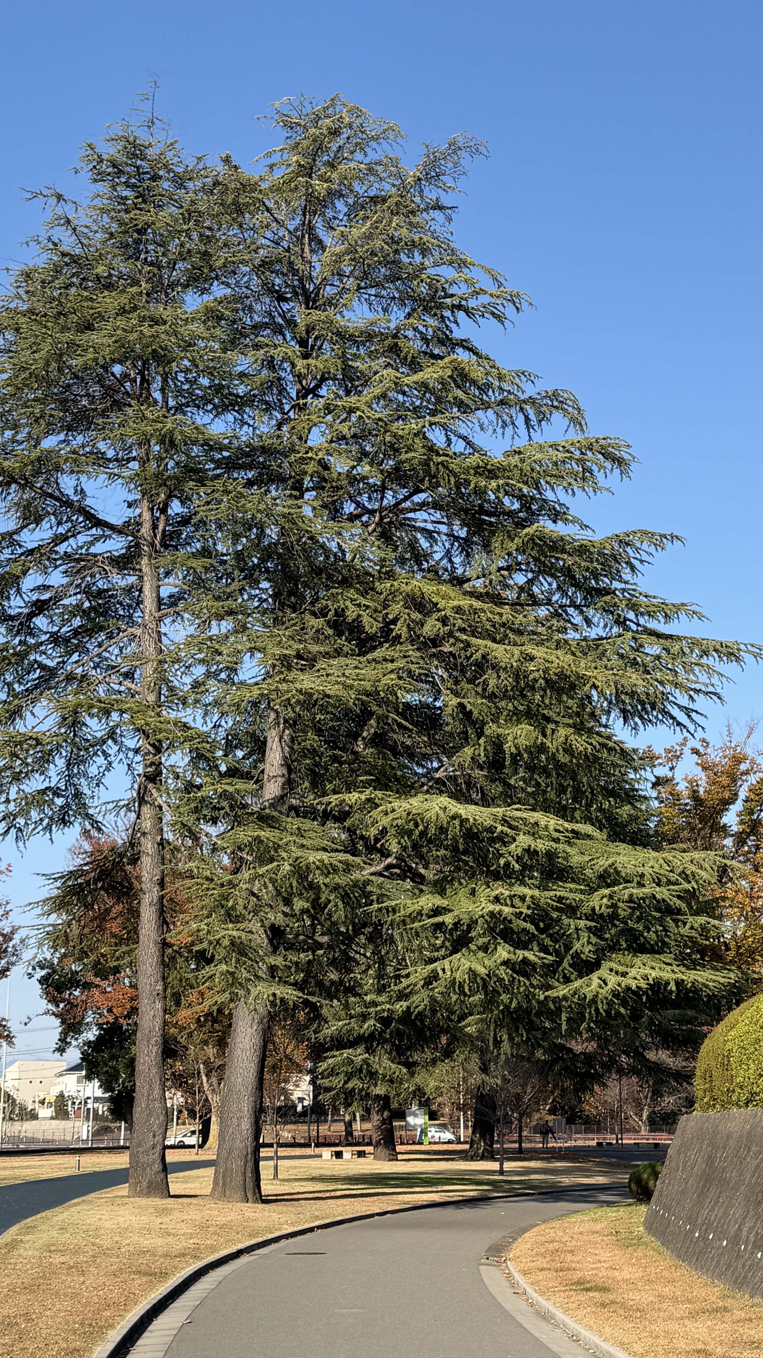 ヒマラヤスギは名前に「スギ」と付きますが、実はマツ科に属する針葉樹です.開花は11月頃で、枝先には数センチほどの細長い雄花が並び、さらに1センチほどのとても小さな雌花も咲きます.ただ、雌花は目立たないため、地上から探してもなかなか見つからないことが多いようです.同じ時期には、前年に受粉した球果がゆっくりと成熟します.その球果の頂部がやがてバラの花のような形になって地面に落ちることから、「シダーローズ」と呼ばれ、冬の散策では思わず笑顔になるような“うれしい発見”として親しまれています.
