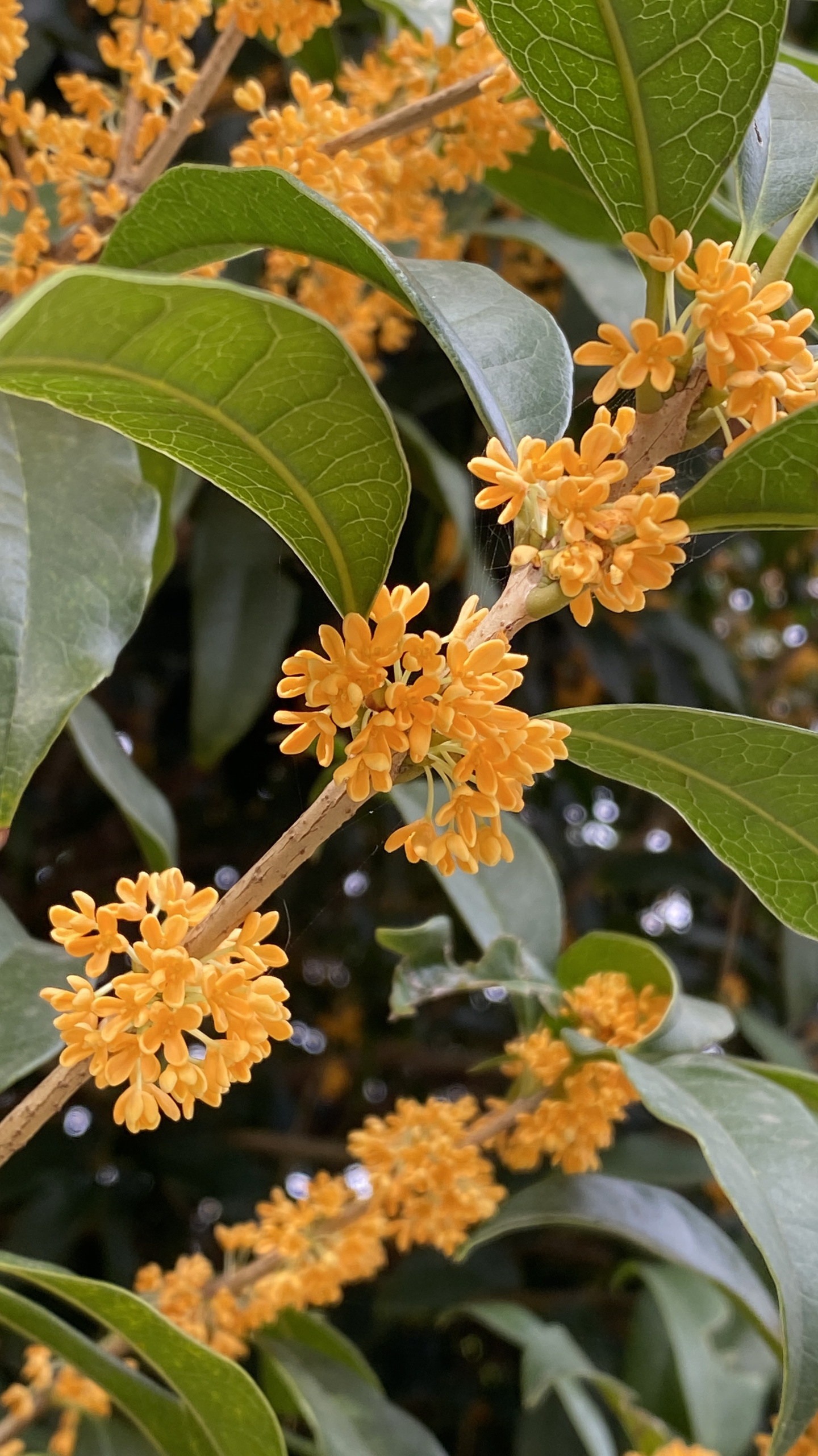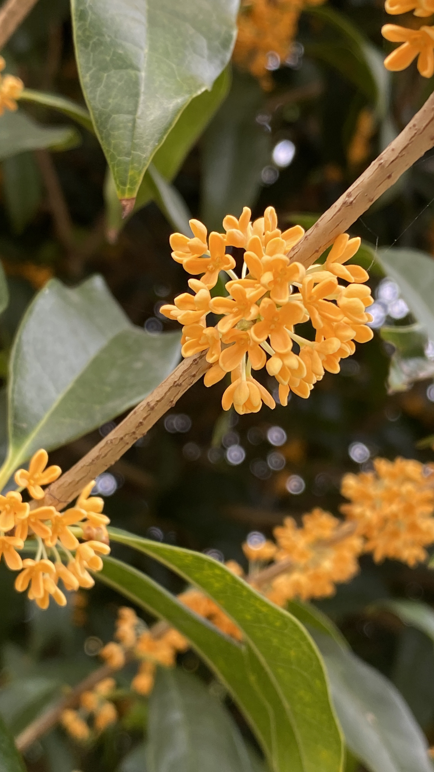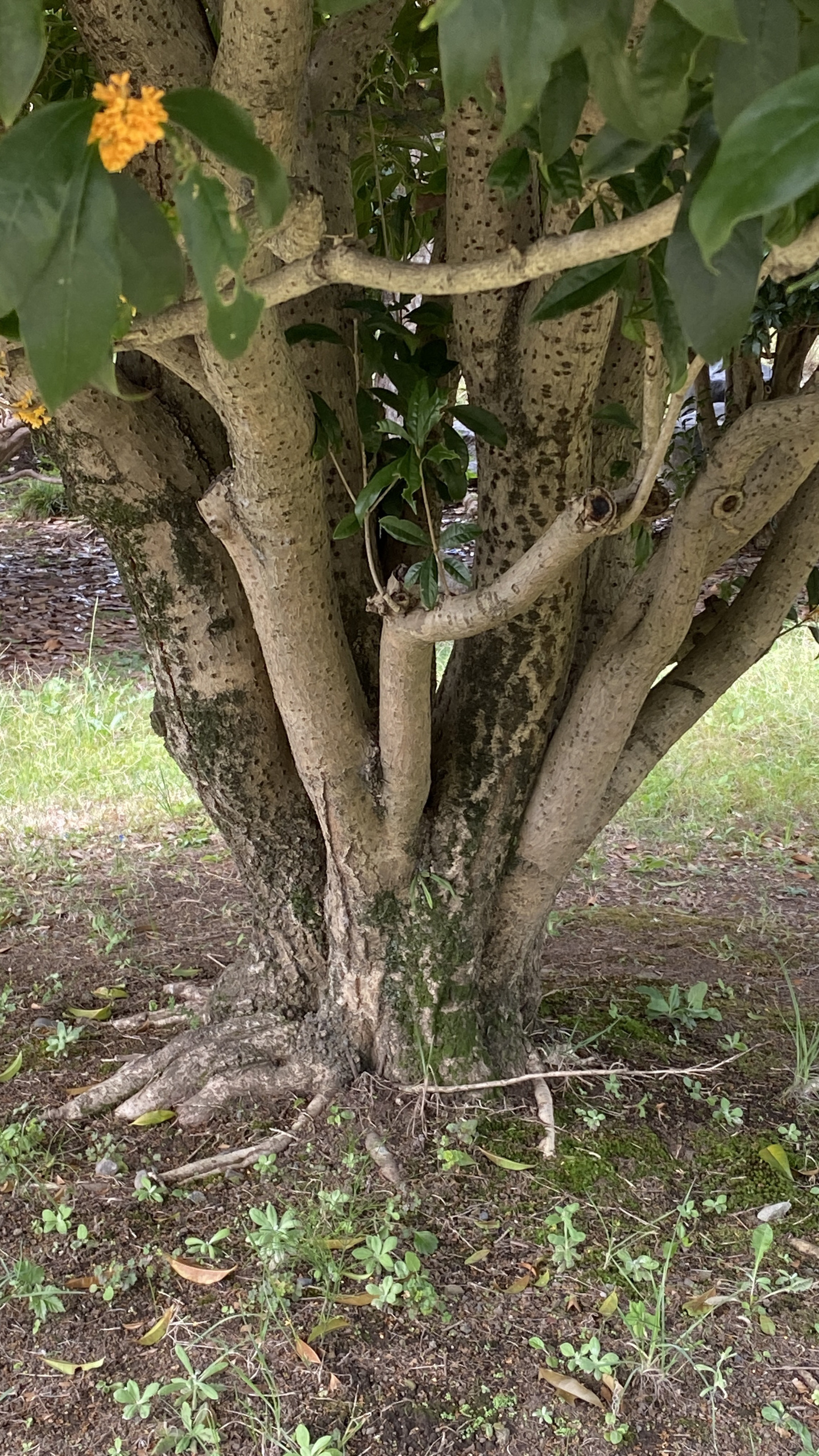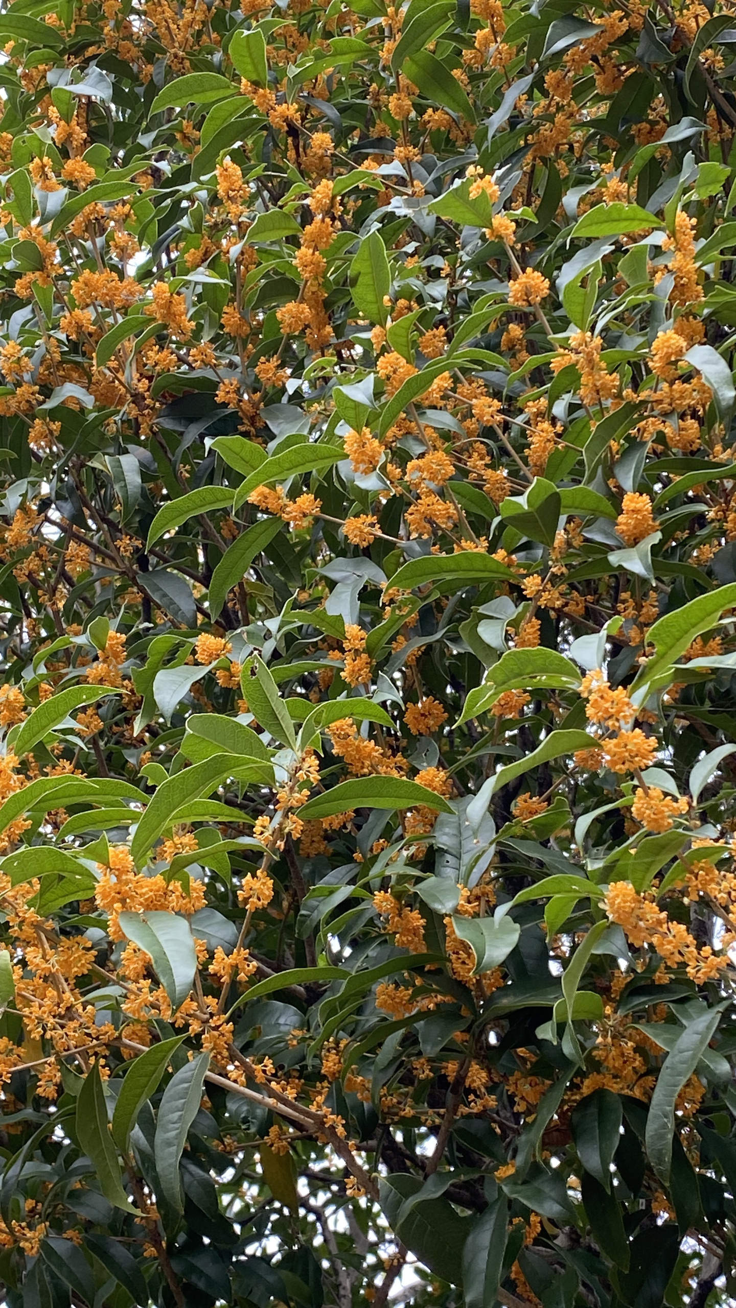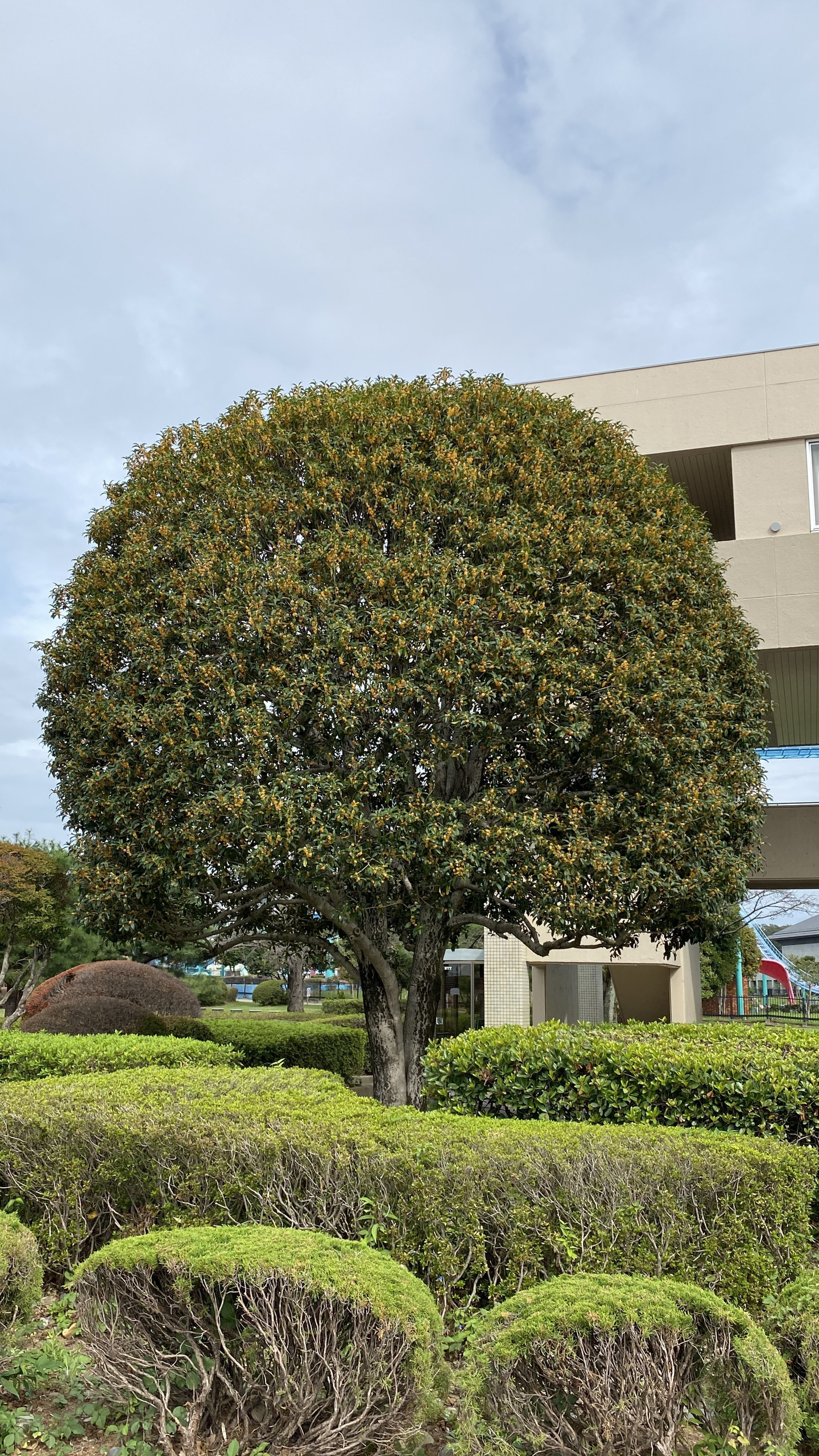 秋の訪れを告げるように,運動公園のあちこちでキンモクセイの甘い香りが漂いはじめます.常緑の広葉樹で、その年に伸びた葉の付け根に、10月上旬ごろに直径4〜5ミリほどの小さな花をたくさん咲かせます.キンモクセイには雌株と雄株がありますが、日本に渡ってきたのは花つきのよい雄株だけなのだそうです.園内では、水生植物園や時計塔広場、および合宿所の周辺でその姿を楽しむことができます.なかでも合宿所そばにある木は、運動公園でもっとも大きく、秋の香りをいちばん豊かに感じられる場所かもしれません.