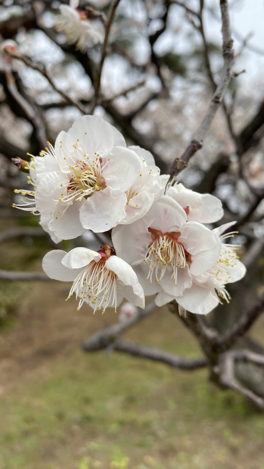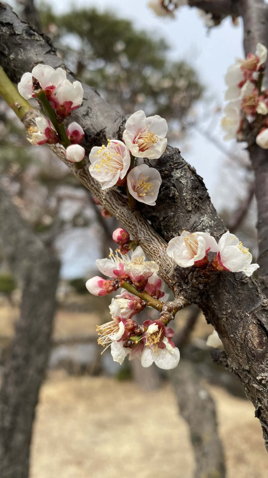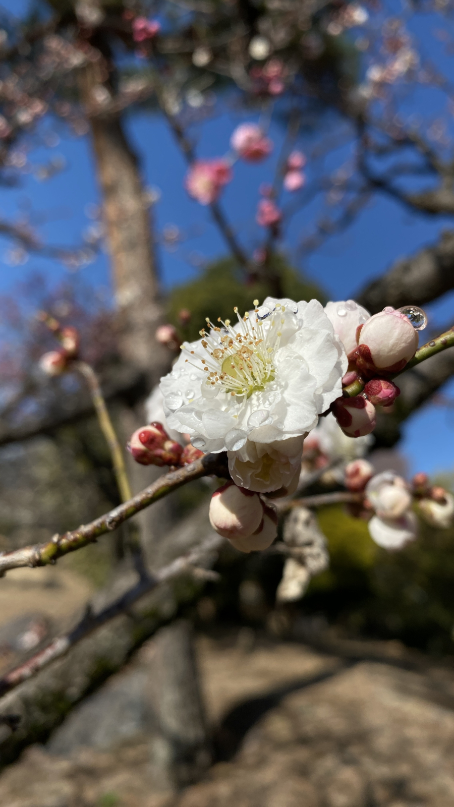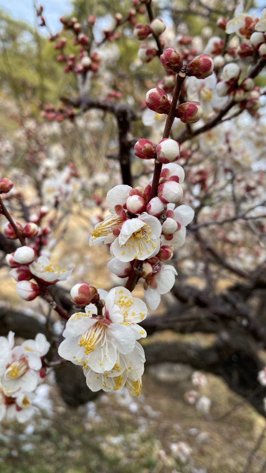 水生植物園には15本の梅の木があり、花の特徴から少なくとも7種類が確認できます。梅の品種は非常に多岐にわたるため、残念ながらこれらの梅の品種を特定するまでには至っておりません.開花とともに微かな香りが漂い、訪れる人々の心を穏やかに癒してくれます.